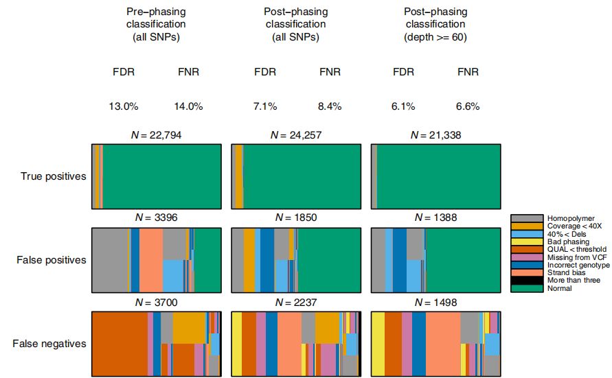使用過濾器改進(jìn)變異檢測,通過phasing和注釋過濾器(Post?phasing classification)顯著改善變異檢測,*佳結(jié)果F1評分為92.2%,F(xiàn)DR為7.1%,F(xiàn)NR為8.5%(表1,圖2中)。進(jìn)一步考慮覆蓋深度>=60X的假定變異位點(diǎn)(基因組的85%)時(shí),觀察到F1得分改善至93.6%,F(xiàn)DR為6.1%,F(xiàn)NR為6.6%(圖2右),這意味著減少或消除覆蓋深度偏差源(如PCR)的操作改進(jìn)在提高z確性方面可以發(fā)揮一定作用。(百邁客目前ONT全基因組重測序和ONT全基因組甲基化測序建庫過程正是PCR-free建庫–direct-DNA建庫,一是可減少覆蓋深度偏好,有利于提高變異檢測z確度;二是可以保留堿基修飾信息,同時(shí)檢測甲基化修飾等信息)