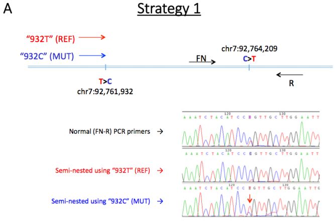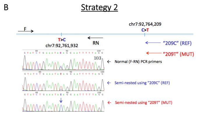 不出所料,ONT數(shù)據(jù)也鑒定到了具有預(yù)期雜合基因型的c.1076 G> A和c.3353 A> G變異。使用ONT reads對其他附近變異進(jìn)行定相,以確認(rèn)新生變異的遺傳和來源(圖3)。這2個(gè)新生突變被定相于一個(gè)199kb的block內(nèi),33條reads(6.1-18.9kb)跨越2個(gè)新生突變位點(diǎn),11條reads包含新生突變等位基因,8條reads包含2個(gè)參考等位基因,表明突變的等位基因是順式的(來自于同一條染色體)。(NA12878數(shù)據(jù)中沒有reads跨越包含2個(gè)位點(diǎn)的突變等位基因。)使用一系列等位基因特異性PCR實(shí)驗(yàn)證實(shí)來自O(shè)NT reads的新生等位基因的單倍型構(gòu)象。相位區(qū)中的側(cè)翼位點(diǎn)表明,父系遺傳的單倍型出現(xiàn)了新生變異(圖3)。