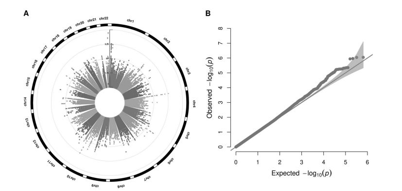基于單個(gè)位點(diǎn)的EWAS分析,鑒定出136個(gè)CpG(p <1e-04),其中30個(gè)CpG(p <1e-05),2個(gè)CpG(p <1e-06)。 沒有位點(diǎn)達(dá)到全基因組顯著性(定義為FDR <0.05),最低FDR = 0.195。 圖中顯示了每個(gè)CpG位點(diǎn)的p值與其染色體位置的曼哈頓圖(圖a)和針對隨機(jī)預(yù)期p值分布繪制的預(yù)估p值的Q-Q圖(圖b)。最顯著CpG?p值表明與隨機(jī)分布的偏差及其陰影區(qū)域的95%置信區(qū)間(圖b),說明這些CpG與BMI的非隨機(jī)關(guān)聯(lián)。