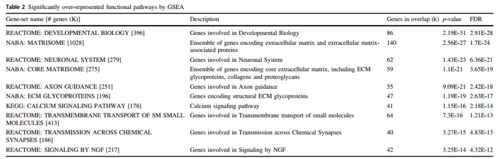 采用biomaRt,38487個(gè)CpG中(P<0.05),23,863個(gè)CpG注釋到2542個(gè)功能基因,基于GSEA在BioCarta 基因集, KEGG 基因集和Reactome基因集富集分析。富集通路相關(guān)基因包括參與編碼細(xì)胞外基質(zhì)(ECM)相關(guān)蛋白,包括ECM糖蛋白、膠原蛋白和蛋白多糖;以及參與神經(jīng)元系統(tǒng)和發(fā)育生物學(xué)的基因。富集結(jié)果也涉及神經(jīng)元功能通路,涉及參與化學(xué)突觸傳遞,軸突導(dǎo)向和NGF信號傳導(dǎo)(神經(jīng)生長因子)的基因。38,487(p < 0.05)個(gè)CpGs采用GREAT分析其富集的調(diào)控區(qū)域。結(jié)果表明15個(gè)具有統(tǒng)計(jì)學(xué)意義(p < 1.072e-10)的生物學(xué)功能聚類,涉及膠質(zhì)細(xì)胞再生正負(fù)調(diào)節(jié)(FE:2.49, FE:2.03)、脂質(zhì)合成負(fù)調(diào)節(jié)( FE:2.61)、甲狀腺發(fā)育 (FE:2.83)、視網(wǎng)膜桿細(xì)胞發(fā)育(FE: 3.54)等。