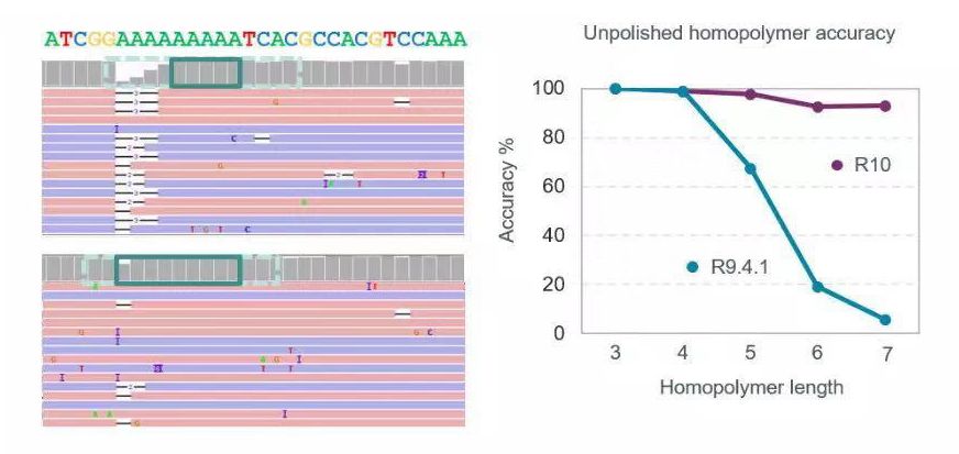 同聚物的識(shí)別準(zhǔn)確性是大家一直都比較關(guān)心的問題,從ONT官方釋放的測試結(jié)果顯示,相比于R9.4.1,R10版本芯片能夠顯著提高其在同聚物區(qū)域的堿基識(shí)別準(zhǔn)確度,并且?guī)缀醪粫?huì)引入缺失錯(cuò)誤(圖5)。