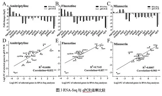 作者為了更好地了解不同種類(lèi)抗抑郁藥誘導(dǎo)的毒性反應(yīng)在非靶向魚(yú)類(lèi)中的作用機(jī)制,用分屬于不同抗抑郁藥物類(lèi)別的阿米替林(Amitriptyline hydrochloride)、氟西?。‵luoxetine hydrochloride)和鹽酸米安色林(mianserin hydrochloride)對(duì)早期發(fā)育階段的斑馬魚(yú)胚胎進(jìn)行處理,然后進(jìn)行了轉(zhuǎn)錄組測(cè)序(RNA-Seq),基于前面轉(zhuǎn)錄組的分析結(jié)果,作者采取兩組qPCR驗(yàn)證實(shí)驗(yàn):