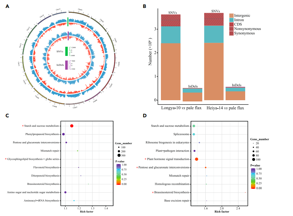 之前有報(bào)道稱栽培亞麻起源于白亞麻,作者將Longya-10與Heiya-14基因組分別與白亞麻進(jìn)行比較分析,在Longya-10中共鑒定到3,623,057 SNV和555,580 個(gè)InDel,Heiya-14中鑒定到3,686,366個(gè)SNV和557,691個(gè)InDel。分別有13.7%和14.2%的SNV落入CDS區(qū)域,其中一半以上是非同義變異。此外,與白亞麻相比,482個(gè)含有這些非同義變異的基因在兩個(gè)品種中得到了正選擇,其中23個(gè)基因與油脂和纖維生物合成相關(guān)。作者對這兩個(gè)品種中含有共同非同義SNV和INDEL的基因進(jìn)行了注釋。結(jié)果表明,在亞麻馴化過程中,開花時(shí)間相關(guān)基因FCA、果實(shí)開裂相關(guān)基因ALC、次生細(xì)胞壁生物合成相關(guān)基因MYB83和種子油脂生物合成相關(guān)基因LEC1子發(fā)生了變異。對這些變異基因進(jìn)行功能富集分析,發(fā)現(xiàn)植物激素信號轉(zhuǎn)導(dǎo)、戊糖和葡萄糖醛酸轉(zhuǎn)換、淀粉和蔗糖代謝以及神經(jīng)鞘糖脂生物合成相關(guān)通路顯著富集,表明植株結(jié)構(gòu)(株高、葉形、分枝方式、直立/匍匐等)、種子產(chǎn)量和/或營養(yǎng)品質(zhì)為主要馴化目標(biāo)。