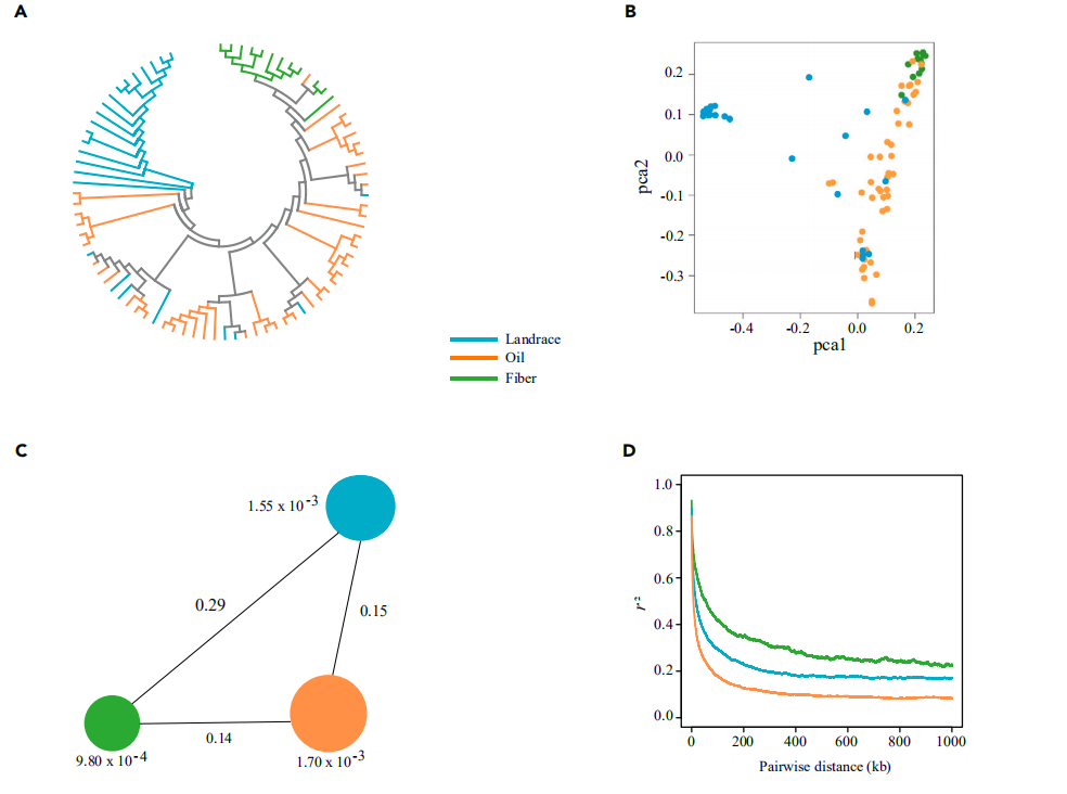 對83份亞麻材料個(gè)體重測序,共產(chǎn)生615 GB數(shù)據(jù),平均深度為11.2×,覆蓋率為97.4%,將測序數(shù)據(jù)與Longya-10基因組比對,共得到2,245,463個(gè)SNP和394,658個(gè)Indels。系統(tǒng)發(fā)育樹與群體結(jié)構(gòu)分析結(jié)果表明,83份亞麻材料分為三大類群,分別屬地方種、油用亞麻和纖維亞麻。油用亞麻與地方種的親緣關(guān)系較近,纖維亞麻的群體多樣性最低(π=9.80×10-4),且具有最長連鎖不平衡(LD)衰減距離(66.7Kb)。SMC++有效群體分析表明,亞麻經(jīng)歷了強(qiáng)烈的瓶頸效應(yīng)。