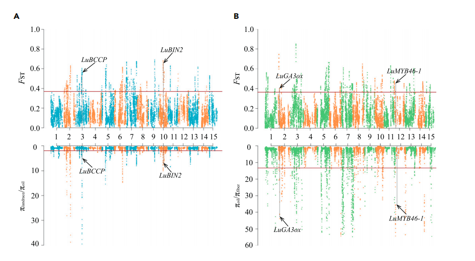 作物改良常常導(dǎo)致受選擇的區(qū)域核酸多態(tài)性降低,將油用亞麻群體和纖維亞麻群體分別與地方種比較分析,油用亞麻中檢測到108個(gè)選擇清除區(qū)域(長度為15.5Mb,1,958個(gè)基因),纖維亞麻中有60個(gè)選擇清除區(qū)域(長度為8.2Mb,1018個(gè)基因),27個(gè)選擇清除區(qū)域重疊。其中α生物素羧基載體蛋白(LuBCCP)、脂氧合酶(LuLOX)、脂肪?;鵄CP硫酯酶A(LuFatA)、脂質(zhì)轉(zhuǎn)移蛋白(LuLTP)和丙酮酸脫氫酶復(fù)合物E2組分(LuPDH-E2)等油脂相關(guān)基因以及種子大小相關(guān)基因LuBIN2LuGW5在油用亞麻中受到選擇。纖維亞麻中,次生細(xì)胞壁生物合成相關(guān)基因(LuMYB46-1、LuXTHLuROPGAP3)和植物株高相關(guān)基因(LuGA3ox、LuGA20oxLuGID)受到選擇。