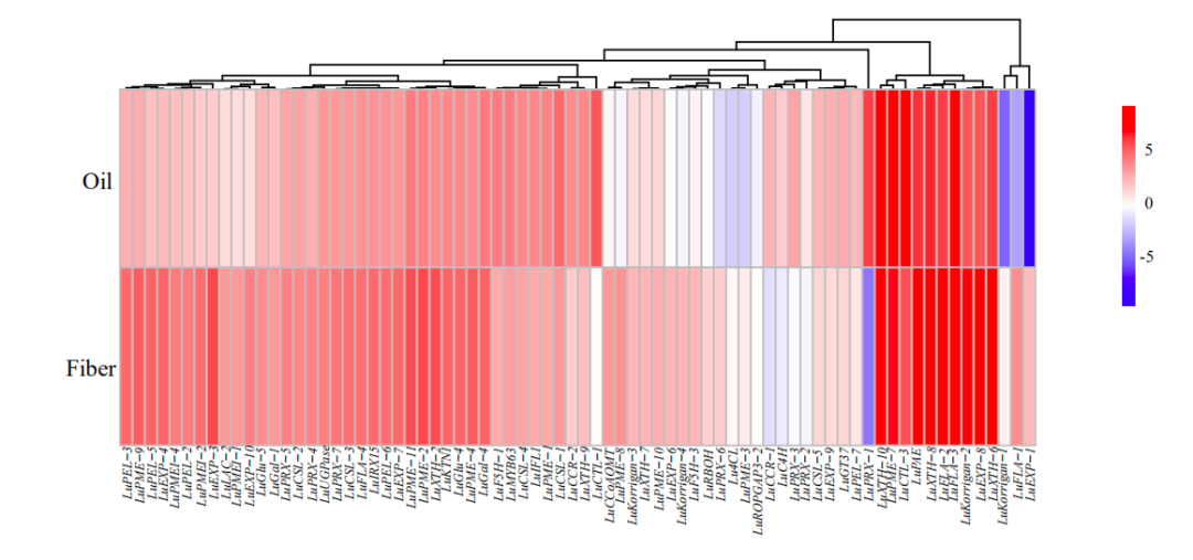 之前有報(bào)道纖維亞麻是從油用亞麻馴化而來,將油用亞麻與纖維亞麻進(jìn)行比較分析,存在47個(gè)選擇清除區(qū)域,其中50.9%與纖維亞麻相對于地方種的選擇區(qū)域重合。這表明在纖維用亞麻改良過程中,這些區(qū)域持續(xù)受到很強(qiáng)的選擇壓力。大約一半的基因(426/867個(gè)基因)僅在油用亞麻和纖維亞麻比較中發(fā)現(xiàn),包含內(nèi)切-β-1,4-葡聚糖酶(LuKorrigan)、果膠甲酯酶(LuPME)和焦磷酸銅合成酶(LuCPS)等。作者將選擇清除區(qū)域與之前報(bào)道的QTL/GWAS位點(diǎn)比較分析,發(fā)現(xiàn)2個(gè)硬脂酸相關(guān)的QTL與油用亞麻選擇區(qū)域重疊,一個(gè)株高相關(guān)的GWAS位點(diǎn)與纖維亞麻選擇區(qū)域重疊,另外3個(gè)油合成相關(guān)的QTL與纖維亞麻選擇區(qū)域重疊,這說明亞麻在馴化過程中受到雙重選擇。