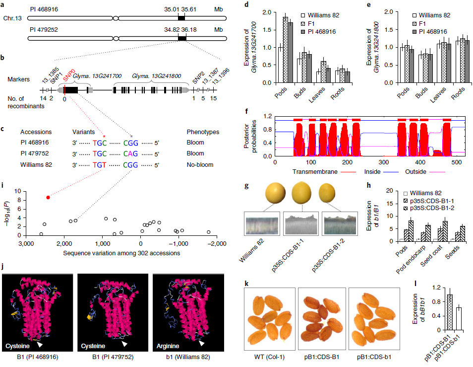 隨后對RIL的兩個子集進行處理,以通過測序(GBS)進行基因分型。基因型和表型數(shù)據(jù)的組合在PI 468916和PI 479752中在13號染色體上種皮開花的基礎(chǔ)上定義了一個區(qū)域(圖2a),該區(qū)域與先前映射的B1區(qū)域重疊,表明這兩個種質(zhì)由B1基因座控制。在映射區(qū)域內(nèi)的其他標記用于鑒定兩個RIL群體中與B1基因座之間的重組體,最后根據(jù)大豆參考基因組序列將B1基因座精細映射到一個包含兩個基因(Glyma.13G241700、Glyma.13G241800)的14.5 kb區(qū)域(圖2b)。對三個親本系的兩個基因進行測序,Williams 82和兩個大豆親本之間的差異只有一個SNP位點,即Glyma13G241700的編碼序列(CDS)中的一個(C到T)點突變,導(dǎo)致氨基酸從半胱氨酸變?yōu)榫彼幔▓D2c)?;ê?周,Glyma.13G241700在發(fā)育中的豆莢中最高表達,其在PI 468916和(Williams 82×PI 468916)F1中的表達水平相似,但均明顯高于Williams 82(圖2d)。相比之下,兩個親本中的Glyma.13G241800和F1的表達水平?jīng)]有顯著差異(圖2e)。這些觀察結(jié)果表明,雙親中的Glyma.13G241700最有可能成為B1的候選基因,預(yù)計B1編碼跨膜轉(zhuǎn)運蛋白樣蛋白(圖2f)。