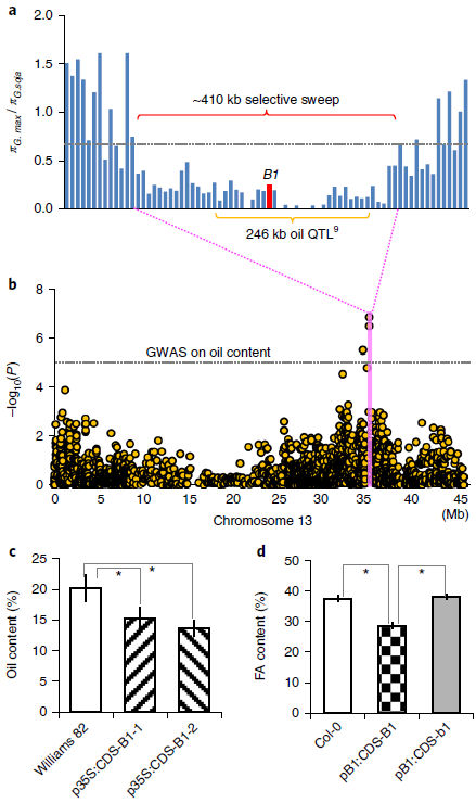 先前通過全基因組關(guān)聯(lián)研究(GWAS)使用302個重測序種質(zhì)的子集,確定了潛在的主要QTL種子油含量,包括46 個G. soja種質(zhì)和127個 G. max種質(zhì)的種子油含量信息(www.ars-grin.gov/npgs)和一個246 kb 的QTL區(qū)域在35,194,140 bp處達到峰值,位于B1基因座的下游約31 kb處(圖3a)與籽油含量的變化顯著相關(guān)。由于G. soja和G. max的種子油含量差異很大,前者的平均值約為10.9%,后者的平均值約為18.0%,因此認為該油脂QTL為可能是造成栽培大豆種子油含量升高的原因。