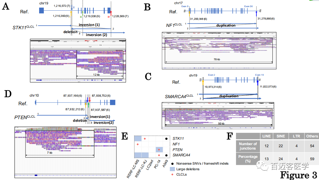 確實(shí),盡管在先前的研究中部分懷疑了這些突變的存在,但在進(jìn)行這項(xiàng)研究之前,它們的確切結(jié)構(gòu)仍然難以捉摸。作者和其他人以前曾根據(jù)這些case的短讀長測序數(shù)據(jù),懷疑存在大的缺失、移碼缺失和剪接位點(diǎn)突變。然而,通過基于短讀長測序的常規(guī)變異檢測,無法檢測到某些情況,在本研究中,這些情況首先被確定為CLCL(圖3E中黑點(diǎn))。