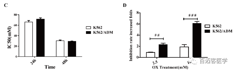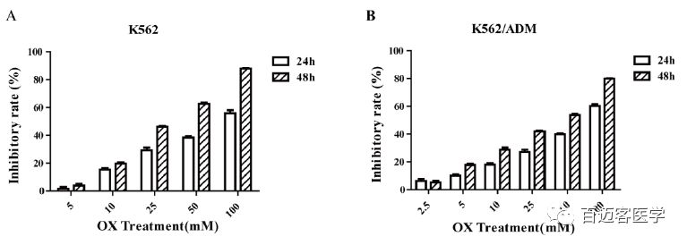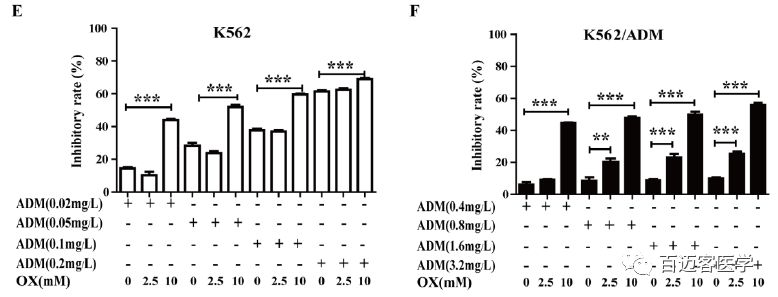 如圖,單獨(dú)用草酸處理的兩個(gè)細(xì)胞系均呈現(xiàn)時(shí)間和劑量依賴性細(xì)胞毒性,但是細(xì)胞毒性相對較低。相比于單獨(dú)用ADM處理,用ADM和草酸聯(lián)合處理后,K562細(xì)胞和K562/ADM細(xì)胞增殖抑制率分別提高了為2.28±0.56倍和6.08±0.77倍,K562/ADM細(xì)胞增殖抑制率的增加倍數(shù)明顯高于K562細(xì)胞。