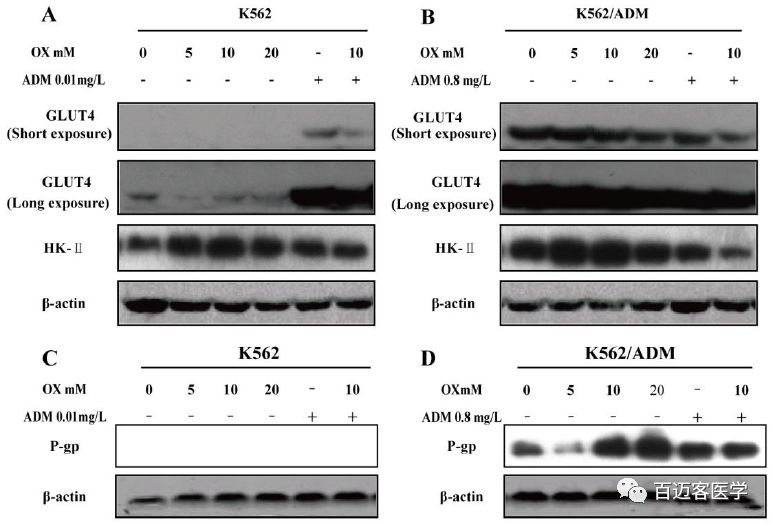 這些數(shù)據(jù)表明,盡管耐藥的K562/ADM細(xì)胞系對藥物的敏感性不如其親本細(xì)胞系,但與草酸聯(lián)合使用時(shí),其療效顯著提高。因此,抑制糖酵解可使K562/ADM細(xì)胞恢復(fù)ADM敏感性。