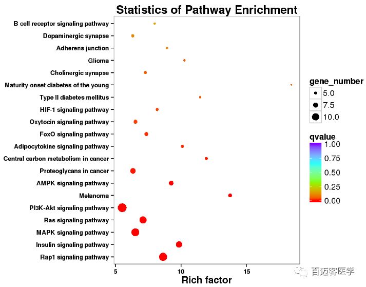 此外,KEGG聚類和富集分析顯示,與K562細(xì)胞相比,K562/ADM細(xì)胞中存在多個(gè)生物學(xué)過程的變化。為了進(jìn)一步闡明糖代謝重編程的分子機(jī)制,將DEG比對到參與葡萄糖代謝的相關(guān)信號轉(zhuǎn)導(dǎo)途徑。所有DEG都是比對到了信號轉(zhuǎn)導(dǎo)途徑,如MAPK、PI3K-AKT、HIF、Ras等。如圖,PI3K-AKT通路是DEG富集最多的通路。PI3K-AKT通路通過調(diào)節(jié)代謝分子(包括LDHA、HK-II和GLUT)的表達(dá)或移位,作為代謝穩(wěn)態(tài)的關(guān)鍵調(diào)控因子。結(jié)果顯示,PI3K-AKT通路是K562/ADM細(xì)胞中最富集的上調(diào)通路,與糖代謝重編程和MDR的發(fā)展有關(guān)。
