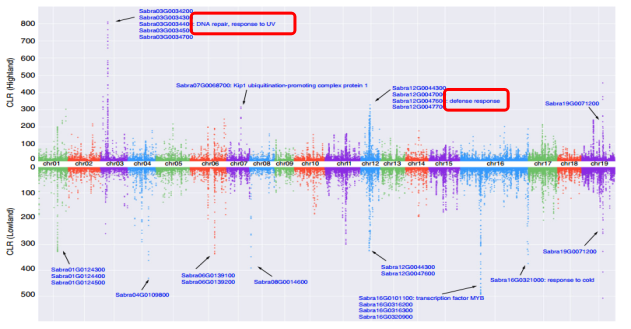 研究結(jié)果2:自然選擇在小墊柳高、低海拔群體中的作用區(qū)域和強度都具有顯著的差異,說明分布于橫斷山區(qū)海拔高差大、生境多樣而異質(zhì)的物種可能在自然選擇的作用下發(fā)生種下的種群分化(Sabra3G0034400DNA修復(fù),Sabra12G0047600細(xì)菌防御應(yīng)答,Sabra16G0101100細(xì)胞對DNA損傷刺激的應(yīng)答和對寒冷的應(yīng)答)。
