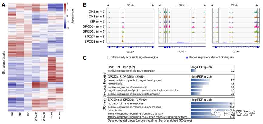 所有特征區(qū)域聚類熱圖將7個T細胞類群按其成熟的順序聚集在一起,突出了T細胞成熟過程中染色質(zhì)可及性的持續(xù)變化(圖2A)。連續(xù)發(fā)育階段的逐漸變化導致了DN3和ISP之間的輕度分離,雙陽性階段CD3和CD3+(圖2A)導致在使用CIBERSORT反褶積算法預測細胞類型預測精度不理想。利用主成分1和2的轉(zhuǎn)換,量化了特征OCRs的重要性并發(fā)現(xiàn)SUMO1激活酶亞基1上有一個峰(圖2B)。此外,OCRs差異可及性附近有階段性特征已知基因如CD8ARAG1/2(圖2B)。雙陽性組OCRs在與造血和白細胞分化相關的terms富集,單陽性組在免疫系統(tǒng)調(diào)節(jié)相關的terms富集(圖2C)。然而,雙陰性特征峰只富集在一個GO-term即白細胞遷移正調(diào)節(jié)(圖2C)。