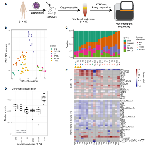 29個PDX模型中有7個對應19個T-ALLs患者中的4個(圖4A),之前被證明可以再現(xiàn)原發(fā)性白細胞樣本的染色質(zhì)可及性,與原始患者相比,ATAC文庫富集在TSS區(qū)域。白血病樣品2,823個細胞特征OCRs PCA分析顯示與健康T細胞分離,將其定位在早期DN2和DN3&ISP發(fā)育階段附近(圖4B)。19例白血病患者中16例早期發(fā)育組DN2和DN3&ISP至少占40%(圖4C)。值得注意的是,即使是被免疫表型分類為成熟的T-ALLs也表現(xiàn)出早期DN2染色質(zhì)可及性概況的實質(zhì)性貢獻,表明即使是以成熟免疫表型為特征的T-ALL亞型也類似于未成熟的胸腺前體(圖4C)。通過ATAC-Seq peaks數(shù)量衡量,染色質(zhì)可及性隨著T細胞的成熟而降低(圖4D)。雖然T-ALLs與早期DN2群體最相似,但是T-ALLs的peaks數(shù)明顯高于分類后的T細胞群(圖4D)。132個早期特異性TF結(jié)合位點如Bach1/2、Maf和Nfe212,109個在白血病中顯著富集,然而115個中間和成熟特異性TFs中只有12個在T-ALLs中富集(圖4E)。在T細胞白血病中,以正常DP和SP階段為特征的TFs結(jié)合位點motifs趨向減少(圖4E)。