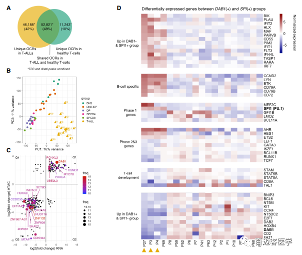 由于患者異質(zhì)性較高(圖5B),作者對每個患者進行了DESeq2差異分析鑒定復發(fā)事件。與健康T細胞前體相比,作者在至少5個T-ALLs中鑒定出292個差異基因和差異可及性OCRs(圖5C)。102個峰/基因可及性強并過表達,191個峰/基因可及性弱并低表達(圖5C)。4例未表達DAB1的患者(P3、P4、P27和P69)形成了一個不同的亞群其特征是SPI1過表達,發(fā)育早期DN2貢獻率特別高(圖4C),3例患者TF SPI1(PU.1)結(jié)合位點可及性更高(圖4E)?;虮磉_和染色質(zhì)可及性差異分析顯示,表達SPI1的患者以基因過表達/超可及性為特征,并決定了T細胞發(fā)育的早期第一階段。這些基因包括MEF2C、MEIS1HOXA9 ,基因特征為B細胞前體如LYN、BTK、cyclin D2CD79A、CD79BCD72(圖5D)。DAB1過表達和超可及性T-ALLs趨向于T細胞發(fā)育后期2和3階段過表達基因如TCF7LEF1RUNX1(圖5D)。綜上所述,這些數(shù)據(jù)涉及到DAB1和SPI1一個未知的相互排斥的生物學意義,并將T細胞發(fā)育階段,即兒童T- ALLs可能起源于成熟T細胞發(fā)育途徑的不同層次,盡管早期水平始終一致。