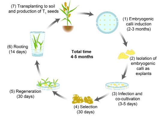 HPTNPTII標(biāo)記的13個(gè)獨(dú)立轉(zhuǎn)基因系的基因組測(cè)序證實(shí)了轉(zhuǎn)基因插入“小米”基因組的正確性,并通過(guò)PCR進(jìn)一步確定了3個(gè)檢測(cè)系的T-DNA插入位點(diǎn)。在盆栽中培育了代表8個(gè)轉(zhuǎn)基因事件的T1植株,觀察到與未轉(zhuǎn)化的“小米”植株沒(méi)有明顯的表型差異。因此,研究者建立了一個(gè)有效的方案,允許在2-3個(gè)月內(nèi)(從農(nóng)桿菌感染算起)或4-5個(gè)月內(nèi)(從成熟種子開(kāi)始愈傷組織算起),完成生產(chǎn)準(zhǔn)備移植到土壤中的轉(zhuǎn)基因植物(圖9)。