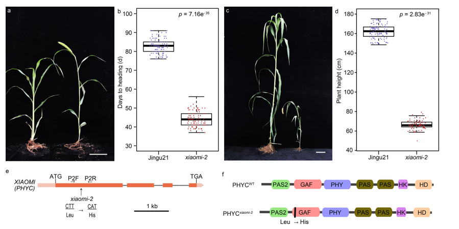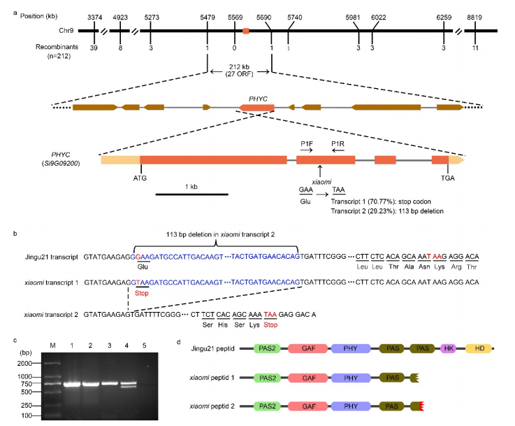 將“小米”基因組序列與經(jīng)基因組重測(cè)序生成的晉谷21基因組序列進(jìn)行比較,發(fā)現(xiàn)在定位區(qū)域只存在一個(gè)突變——“小米”基因Si9g09200的編碼區(qū)從“G”到“T”的突變,該基因編碼一種假定的PHYC蛋白(圖2a)。在所檢測(cè)的77個(gè)早期抽穗F2個(gè)體中,均為T(mén)/T純合突變體。相比之下,在256個(gè)晚抽穗個(gè)體中,92個(gè)是G/G WT純合子,另外164個(gè)是G/T雜合子,反映了基因型和表型之間的完美關(guān)聯(lián)。這種突變產(chǎn)生了一個(gè)終止密碼子,形成一個(gè)截短的蛋白質(zhì),占該基因約71%的轉(zhuǎn)錄本(轉(zhuǎn)錄本1)(圖2a-d)。這一突變還導(dǎo)致了113 bp的移碼缺失的剪接,形成了占該基因約29%轉(zhuǎn)錄本(轉(zhuǎn)錄本2)的截短蛋白(圖2a-d)。根據(jù)預(yù)測(cè),被截?cái)嗟牡鞍踪|(zhì)缺少第二個(gè)PAS結(jié)構(gòu)域的三分之二(肽1)或三分之一(肽2),以及整個(gè)HK和HD域(圖2d)。