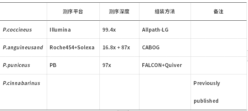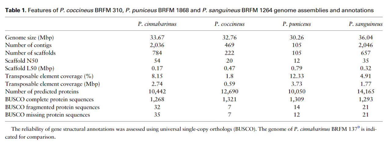 分別對(duì)P.coccineus、P.sanguineusandP. puniceus、P.cinnabarinus的基因組進(jìn)行測(cè)序和組裝,四種真菌基因組大小差異不大,編碼基因組的數(shù)量上也比較接近。