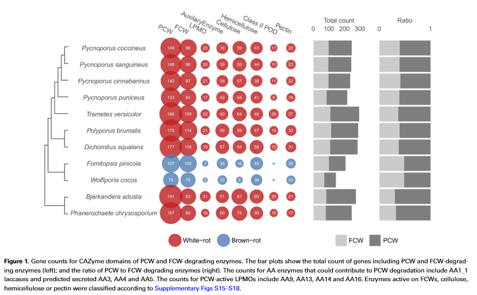 與褐腐菌相比,白腐菌含有更高比例的PCW(植物細(xì)胞壁)降解活性相關(guān)的CAZymes和FCW(真菌細(xì)胞壁)降解活性相關(guān)的CAZymes,這也是白腐菌與褐腐菌降解木質(zhì)纖維素的能力不同的重要原因。