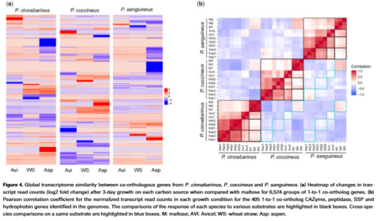 我們知道擔(dān)子菌門(mén)分解木材主要是與纖維素相關(guān)的水解酶和氧化酶起著關(guān)鍵作用。因此文章整體思路比較明確,從纖維素代謝相關(guān)的這些水解酶和氧化酶方面著手,通過(guò)比較屬間這一系列酶的異同和相關(guān)基因表達(dá)模式的異同,尋找出規(guī)律,最終得出結(jié)論。擔(dān)子菌門(mén)是比較重要的一類真菌門(mén),涉及到擔(dān)子菌門(mén)下的真菌基因組測(cè)序比較多,本文的研究對(duì)今后的這一類真菌基因組研究有一定的參考意義。