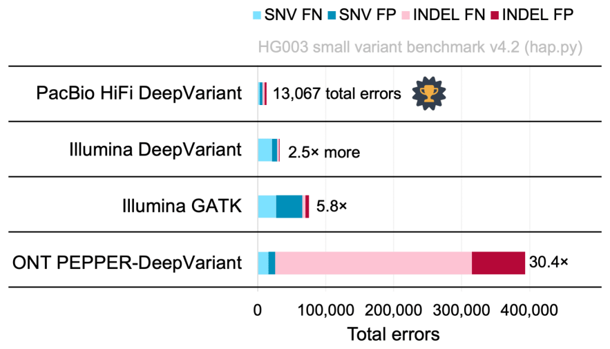 另外,由下圖可以看出(圖7),Google DeepVariant使用HiFi數(shù)據(jù)提交的結(jié)果在所有單一技術(shù)檢測全基因組范圍內(nèi)的變異z確性*高,對SNV√確度和召回率可以達到99.9%,對插入缺失的√確度和召回率可以達到99.4%[2]。