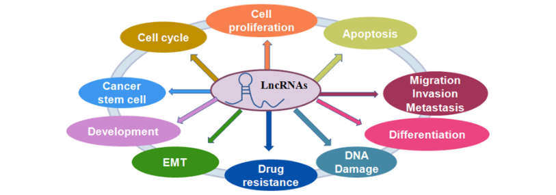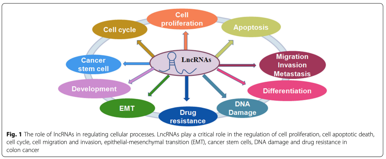 越來(lái)越多的證據(jù)表明,lncRNA在結(jié)腸癌的發(fā)生和發(fā)展中起著至關(guān)重要的作用,一項(xiàng)研究使用TCGA數(shù)據(jù)集的RNA測(cè)序數(shù)據(jù)在結(jié)腸腫瘤中鑒定了大約200個(gè)差異表達(dá)的lncRNA。LncRNA與患者預(yù)后,細(xì)胞增殖,細(xì)胞凋亡,細(xì)胞轉(zhuǎn)移和侵襲,細(xì)胞周期,上皮-間質(zhì)轉(zhuǎn)化(EMT),癌癥干細(xì)胞(CSC)和耐藥性相關(guān)(圖1)。