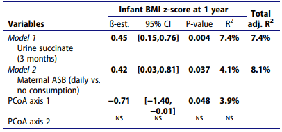 最后,在完整數(shù)據(jù)集上使用一個(gè)多變量線性模型,作者測試了母親ASB消耗量、微生物群落組成、與高ASB消耗量關(guān)聯(lián)的兩種代謝物與1歲嬰兒BMI z-score間的關(guān)系。此隊(duì)列中嬰兒出生時(shí)體重與一歲時(shí)的BMI沒有相關(guān)性。然而,多變量線性模型證實(shí)母親ASB日消耗量與嬰兒較高的BMI相關(guān),并表明BMI與12個(gè)月時(shí)微生物組成有關(guān)但與3個(gè)月時(shí)無關(guān)(表3)。值得注意的是,琥珀酸與BMI呈正相關(guān),與亞精胺無關(guān),表明這種關(guān)聯(lián)也可能涉及微生物來源的代謝物(表3和圖4d)。