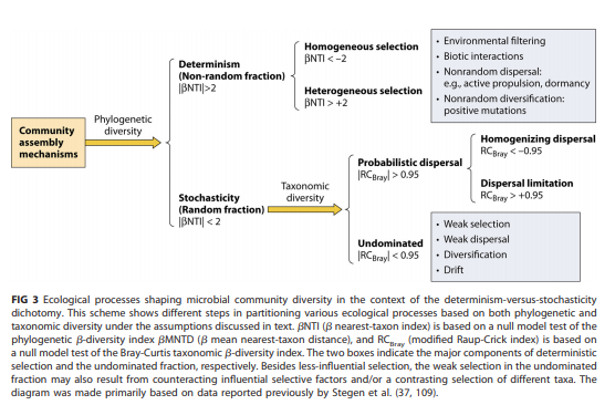 微生物群落生態(tài)學(xué)的一個(gè)主要目標(biāo)是了解構(gòu)成跨時(shí)空物種豐度模式的過程。確定性和隨機(jī)性兩種類型的過程會(huì)影響群落的聚集。確定性過程與生態(tài)選擇相關(guān),隨機(jī)過程包括不可預(yù)測的擾動(dòng)、概率性的散布和隨機(jī)的出生-死亡事件等,這些變化不是由環(huán)境決定的適應(yīng)性結(jié)果。通過零模型量化群落的絕對(duì)系統(tǒng)發(fā)育距離與隨機(jī)系統(tǒng)發(fā)育距離的偏離度,偏離程度越大,群落受確定性因素的影響越大,偏離度越小,群落受隨機(jī)性因素的影響越大。通常使用βNTI(最近種間親緣關(guān)系指數(shù))以評(píng)估不同時(shí)空尺度下隨機(jī)性和確定性過程對(duì)微生物群落組裝的影響。