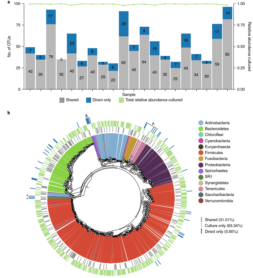 作者判斷OTU可培養(yǎng)的條件:1)至少10條序列;2)至少1個富集板中回收到且豐度比例至少為0.01%。直接測序鑒定到的OTU中82.13%是可培養(yǎng)的,這些可培養(yǎng)的在所有直接測序的樣本中平均豐度比例為99.3%(圖2a),富集培養(yǎng)擴增子測序比直接測序獲得更多的OTUs(圖2b),如樣本1恢復(fù)到49個OTUs,其中42個在富集培養(yǎng)中也恢復(fù)到,富集培養(yǎng)還恢復(fù)了額外的124個OTUs(圖2a)。