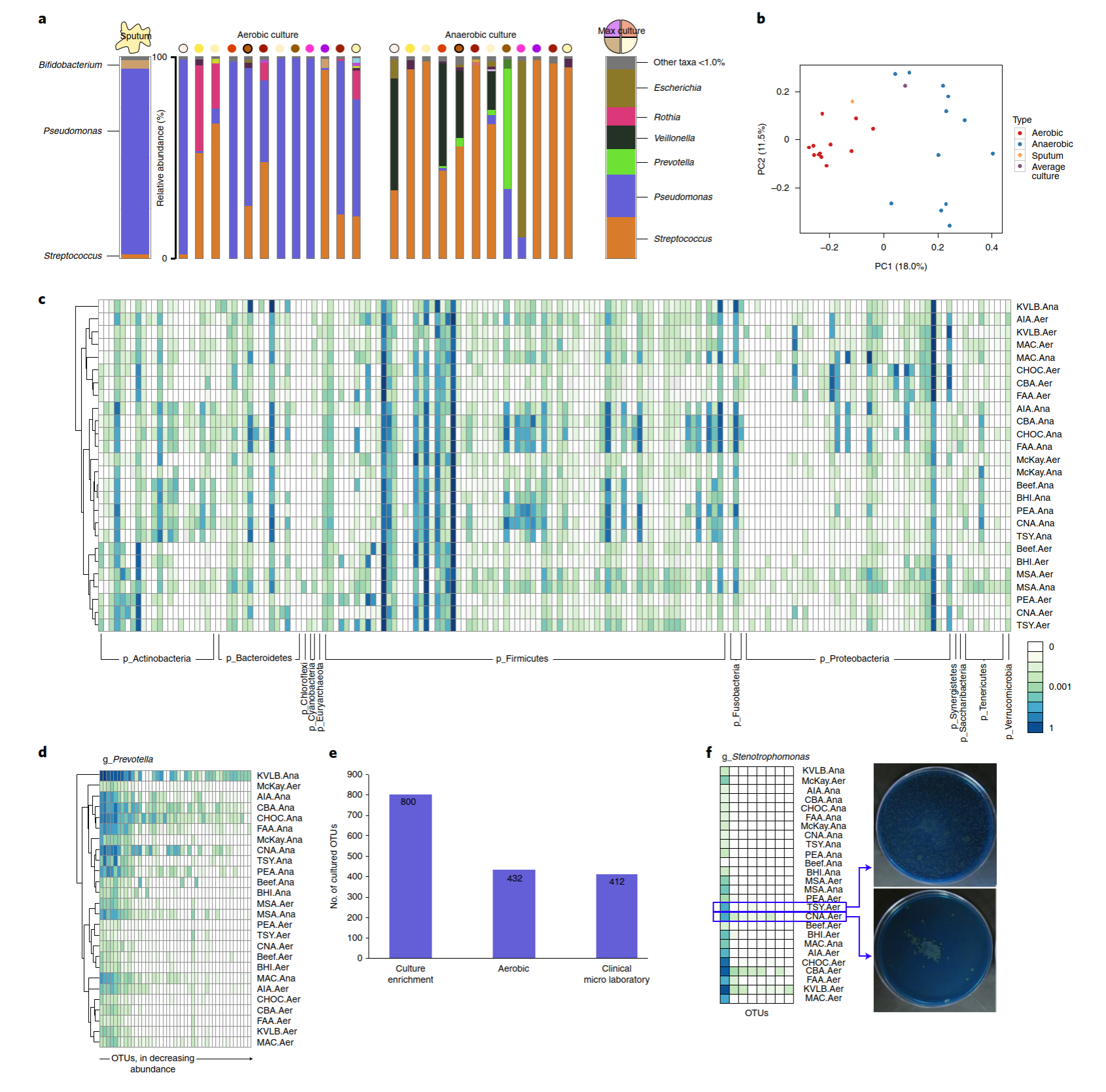培養(yǎng)基類型和培養(yǎng)環(huán)境對于微生物菌群多樣性是重要的。富集培養(yǎng)和直接16S測序結(jié)果中物種分布和β多樣性結(jié)果表明有氧和厭氧條件促進了不同的物種恢復(fù)(圖3a,b)。不同培養(yǎng)基類型的物種進行聚類顯示選擇性培養(yǎng)和非選擇性培養(yǎng)的重要性(圖3c),有些屬的生長模式也存在OTU依賴差異(如普氏菌屬,圖3d)。作者在臨床實驗室常用的4種典型培養(yǎng)條件的基礎(chǔ)上,擴展了培養(yǎng)條件,獲得將近2倍的OTUs(圖3e)。富集培養(yǎng)的另一個優(yōu)點是可以從凍存細菌中回收感興趣的微生物。嗜麥芽窄食單胞菌從兩個凍存的脫脂牛奶塊中分離得到,其相對豐度比例很低(1.3%和1.5%),牛奶塊在特定的培養(yǎng)基類型培養(yǎng)(圖3f)。