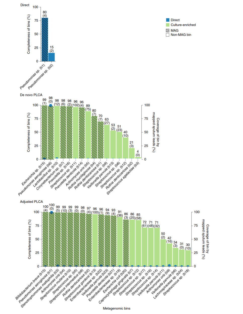 作者將擴增子測序與富集培養(yǎng)宏基因組測序相結(jié)合研究人類微生物群落。以肺囊性纖維化為例,平均培養(yǎng)了82.13%的可操作分類單元(OTUs),占痰液樣本直接測序所鑒定的相對豐度的99.3%,更重要的是,與直接測序相比,富集培養(yǎng)方法鑒定的OTUs多了63.3%。作者開發(fā)了平板覆蓋算法(PLCA),以確定富集培養(yǎng)平板的代表性子集,從而在該子集上進行宏基因組研究。與不依賴培養(yǎng)的方法相比,可以恢復(fù)更多的物種多樣性(包含更好的低豐度物種的組裝基因組,MAGs),更長的重疊群和更好的功能注釋結(jié)果。PLCA算法也可以應(yīng)用于此前發(fā)布的腸道菌群數(shù)據(jù)集,富集培養(yǎng)分子圖譜可以更好的了解微生物菌群在人類健康和疾病中的作用。