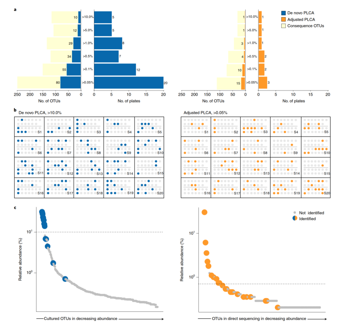 作者采用了PLCA算法,來決定需要進行富集培養(yǎng)宏基因組測序的最小樣品數(shù),算法對任何含有大部分可培養(yǎng)富集的菌群生態(tài)均適用。PLCA算法有兩個版本,從頭 PLCA不依賴于直接測序結(jié)果再現(xiàn)富集培養(yǎng)菌群,而校正PLCA側(cè)重于直接測序結(jié)果中OTU的修復(fù),這取決于是否都對原始樣品的菌群組成感興趣。采用這兩種算法,數(shù)據(jù)集凸顯了不同樣本的獨特性:從頭PLCA顯示,每個樣本具有獨特的平板集,并且每個培養(yǎng)條件對每個樣本都是必要的;校正PLCA顯示對數(shù)據(jù)集中樣本進行富集培養(yǎng)宏基因組測序是很有必要的(圖4a,b)。
