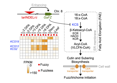 本研究通過對(duì)215份亞洲棉自然群體的種子短絨和無茸毛性狀進(jìn)行全基因組關(guān)聯(lián)分析(GWAS),鑒定得到位于A08染色體末端的一個(gè)長(zhǎng)度為6.2 kb的插入片段與短絨和葉茸毛表型顯著相關(guān),并發(fā)現(xiàn)該片段可能扮演遠(yuǎn)端增強(qiáng)子角色,可以特異激活其下游短絨發(fā)育關(guān)鍵基因GaFZ的表達(dá)。同時(shí),在擬南芥和陸地棉中過表達(dá)GaFZ基因,發(fā)現(xiàn)GaFZ基因負(fù)調(diào)控短絨和葉茸毛的發(fā)育。進(jìn)一步共表達(dá)和互作分析顯示,GaFZ基因可能通過抑制超長(zhǎng)鏈脂肪酸伸長(zhǎng)途徑中的基因表達(dá)來影響短絨和葉茸毛的發(fā)育。
