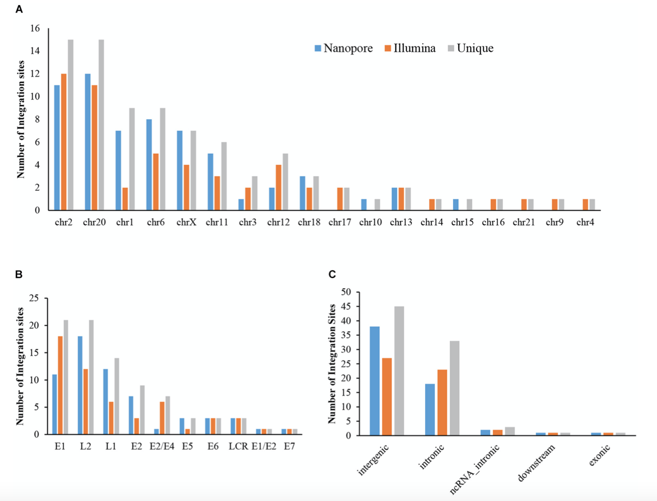 作者通過Nanopore和Illumina測序對先前發(fā)表的樣品的整合位點進行了重新測序。在對結果進行分析之后,得出了三點結論:首先,從所有三個數(shù)據(jù)集(即,Nanopore,Illumina和已發(fā)布的數(shù)據(jù))中找到了19個先前發(fā)布的整合位點中的13個,表明這些元素之間具有很高的重疊率和可比性;其次,與先前發(fā)表的論文相比,Nanopore和Illumina數(shù)據(jù)確定了66個獨特的整合位點,其中13個已通過Sanger測序驗證,這表明與公開數(shù)據(jù)相比,作者的結果對整合位點的檢測靈敏度更高;第三,作者建立了可用于通過納米孔測序數(shù)據(jù)檢測HPV整合位點的pipeline,并且無需進行糾錯分析??偠灾c現(xiàn)有的Illumina數(shù)據(jù)分析pipeline方法相比,測試了一種新的納米孔數(shù)據(jù)分析方法,并證明了該方法在整合位點檢測中是可靠的,所需的測序數(shù)據(jù)更少。它提供了有力的證據(jù)和工具來支持納米孔在病毒狀態(tài)識別中的潛在應用。