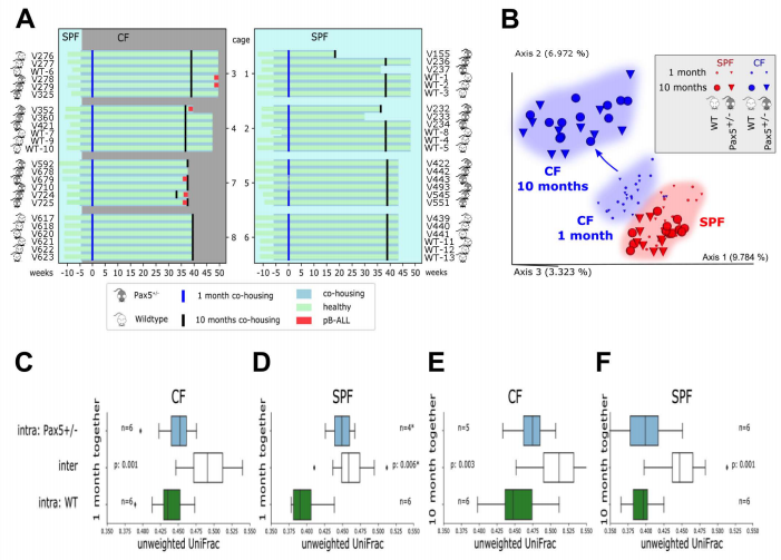 為了研究腸道微生物群在Pax5+/-小鼠PB-ALL發(fā)育中的作用,我們建立了一個(gè)由24只對(duì)照仔鼠野生型(WT)和24只Pax5+/-雌性小鼠組成的小鼠隊(duì)列。每籠飼養(yǎng)6只小鼠,分別飼養(yǎng)在混合基因型籠子(每個(gè)基因型3只,籠子1-4)或相同基因型籠子(同一基因型6只小鼠,籠子5-8)中(圖1A)。