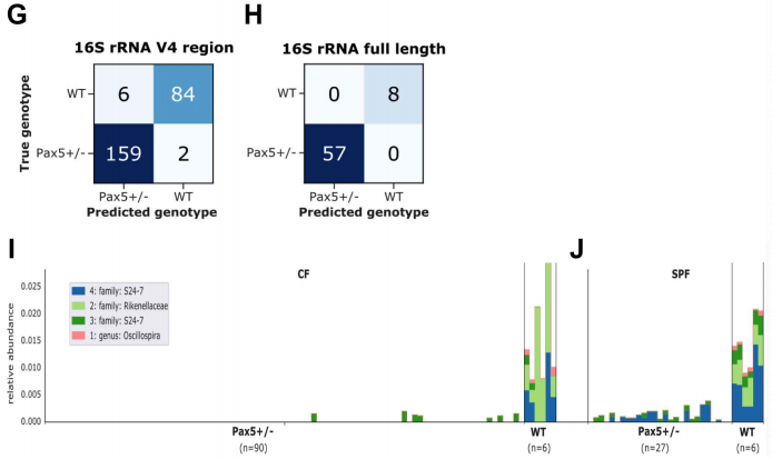 我們通過獨(dú)立地將機(jī)器學(xué)習(xí)方法應(yīng)用于3983個(gè)ASV,進(jìn)一步將基因型分離ASV的集合細(xì)化到只有40個(gè)。ASV根據(jù)特征重要性進(jìn)行排序,由“隨機(jī)森林”算法確定,41個(gè)ASV用50%的樣本進(jìn)行訓(xùn)練,并在剩余50%的樣本上進(jìn)行測試。這40個(gè)ASV足以準(zhǔn)確(96.8%)預(yù)測小鼠基因型(圖1G)。事實(shí)上,這種機(jī)器學(xué)習(xí)工具能夠預(yù)測小鼠的基因型,這證實(shí)了Pax5雜合性形成了特定的腸道微生物群落。值得注意的是,16S rRNA全長測序使我們僅使用5212個(gè)全長ASV中的4個(gè),就進(jìn)一步提高了Pax5+/-和WT動(dòng)物之間的基因型預(yù)測的準(zhǔn)確性,準(zhǔn)確率達(dá)到100%(圖1H)。WT和Pax5+/-小鼠微生物群的主要區(qū)別在于Pax5+/-小鼠缺乏完整的共生菌。具體地說,在WT小鼠中可以檢測到的Rikenellaceae、S24-7和Oscillospira屬的成員在CF的Pax5+/-小鼠的微生物群落中缺失(圖1I)。在SPF中,在Pax5+/-小鼠的微生物群落中沒有檢測到Rikenellaceae和Oscillospira屬的成員(圖1J)。