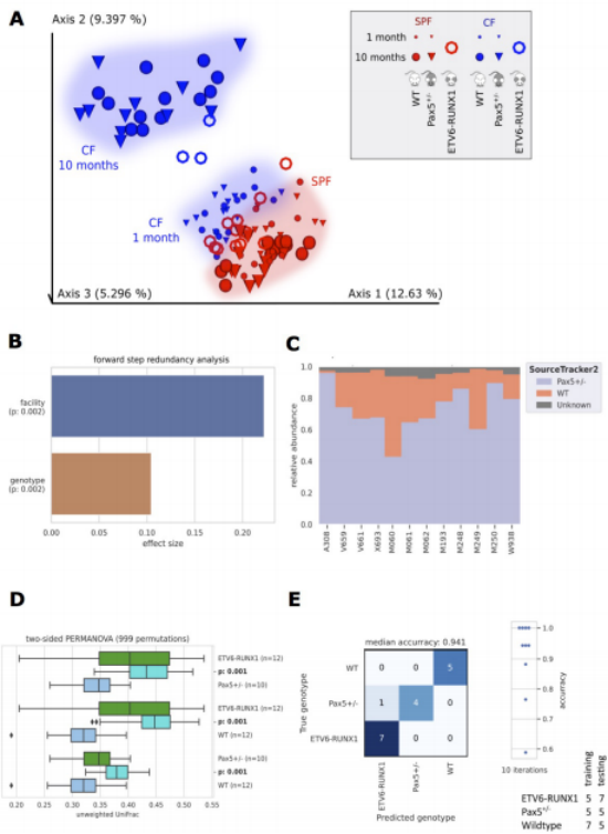 Sca1-ETV6-RUNX1小鼠在SPF組10個(gè)月時(shí)和CF組3~4個(gè)月時(shí)進(jìn)行微生物群分析。將這些數(shù)據(jù)與我們之前的分析相結(jié)合,證實(shí)了環(huán)境(設(shè)備)和基因型是形成腸道微生物群的關(guān)鍵因素(圖2A,B)。SourceTracker2分析表明,Pax5+/-微生物來源在Sca1-ETV6-RUNX1微生物群的組成中也很突出(圖2C),PERMANOVA分析結(jié)果證實(shí),所分析的基因型形成的微生物群有統(tǒng)計(jì)學(xué)上的顯著差異(圖2D)。使用10個(gè)最重要的ASV(有1000棵樹的隨機(jī)森林),可以通過機(jī)器學(xué)習(xí)準(zhǔn)確地預(yù)測易感基因型(圖2E)。這些分析證實(shí),在遺傳上易患PB-ALL的基因型都有不同的微生物群,獨(dú)立于外圍的B細(xì)胞有缺陷。
