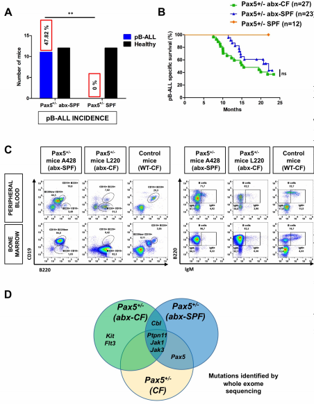 在23只小鼠中,11只(47.82%)在11.4到20.7月齡之間出現(xiàn)了PB-ALL,而SPF中未經(jīng)治療的Pax5+/-小鼠(n=12)沒有發(fā)生白血病(圖4A-D)。這些白血病在表型、組織學(xué)、克隆性和遺傳學(xué)特征上與暴露于自然感染的Pax5+/-小鼠中出現(xiàn)的白血病相似。這表明,完整的微生物群可以保護(hù)遺傳易感的小鼠免受白血病的侵襲,即使在沒有感染環(huán)境的情況下,通過抗生素治療后的細(xì)菌枯竭來改變微生物群也可能引發(fā)白血病。