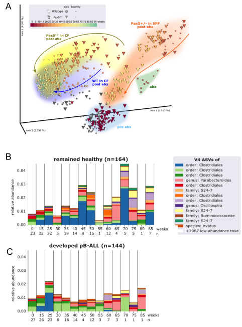 我們首先證實(shí),抗生素治療后的微生物群落以一種依賴于基因型的方式再生,并且能夠隨著時(shí)間的推移而重建(圖5A)。接下來,我們將Pax5+/-發(fā)展為PB-ALL的小鼠的腸道微生物群與在整個(gè)實(shí)驗(yàn)過程中保持健康的小鼠的腸道微生物群進(jìn)行了比較。通過對(duì)所有時(shí)間點(diǎn)應(yīng)用離散FDR,我們確定了3983個(gè)已鑒定的V4-ASV中的42個(gè)在白血病前期Pax5+/-小鼠(n=144,糞便樣本)和健康Pax5+/-小鼠(n=164,糞便樣本)之間差異豐富(圖5B,C)。這些發(fā)現(xiàn)將遺傳易感性和耗盡的微生物群與那些將患上感染驅(qū)動(dòng)的PB-ALL的Pax5+/-小鼠聯(lián)系在一起。綜上所述,這些發(fā)現(xiàn)表明腸道微生物群有可能被用作早期生物標(biāo)記物來識(shí)別易患白血病的遺傳易感小鼠。