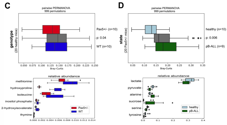 在這里,利用pB-ALL的小鼠模型,我們的結(jié)果表明,在生命早期抗生素治療引起的微生物群干擾足以在遺傳易感小鼠中誘發(fā)白血病,即使在沒有感染性刺激和獨(dú)立于T細(xì)胞的情況下也是如此。通過對(duì)一系列糞便樣品進(jìn)行16S V4和16S rRNA全長測序,我們發(fā)現(xiàn)pB-ALL(Pax5雜合性或ETV6-RUNX1融合)的遺傳易感性形成了一個(gè)不同的腸道微生物群。使用3983個(gè)擴(kuò)增序列變異(ASV)中的40個(gè)作為細(xì)菌物種的替代物,機(jī)器學(xué)習(xí)準(zhǔn)確地預(yù)測了遺傳易感性(96.8%)。將野生型(WT)或Pax5+/-造血骨髓細(xì)胞移植到WT受體小鼠,發(fā)現(xiàn)微生物群是以供體基因型特異性的方式形成和確定的。氣相色譜-質(zhì)譜(GC-MS)分析來自WT和Pax5+/-小鼠的血清表明存在基因型特異性的獨(dú)特代謝組譜。綜上所述,我們的數(shù)據(jù)表明,是缺乏共生微生物群落,而不是特定細(xì)菌的存在,促進(jìn)了遺傳易感小鼠的白血病。未來需要進(jìn)行大規(guī)模的縱向研究,以確定對(duì)易患pB-ALL的兒童進(jìn)行有針對(duì)性的微生物群落調(diào)整是否能成為一種成功的預(yù)防策略。