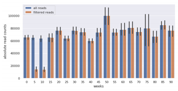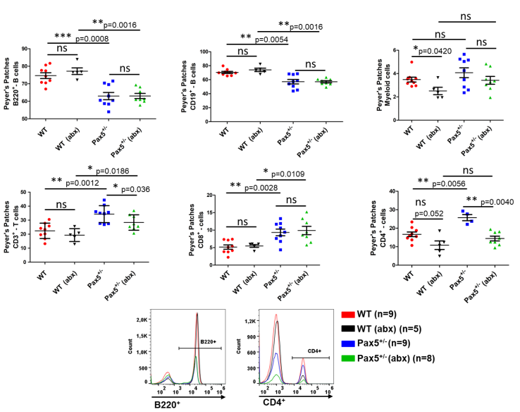 我們?cè)O(shè)立了第二個(gè)小鼠隊(duì)列,命名為“ABX”,并用抗生素治療這些小鼠以清除細(xì)菌。這個(gè)隊(duì)列由27只Pax5+/-和18只WT小鼠組成,我們?cè)谵D(zhuǎn)移時(shí)(在服用抗生素之前)、抗生素治療后4周和8周收集糞便顆粒,然后每兩周收集一次,直到一只小鼠出現(xiàn)明顯的PB-ALL癥狀或達(dá)到其自然壽命的終點(diǎn)。通過微生物分析、糞便DNA濃度分析和16S rRNA擴(kuò)增序列測定(圖S7),證實(shí)了抗生素雞尾酒的殺菌效果。在抗生素治療期間從小鼠身上收集的糞便樣本主要包含來自它們植物性飲食的Read(平均82%的Read可以歸類為葉綠體或線粒體來源)。當(dāng)我們分析抗生素治療對(duì)不同器官造血室的影響時(shí),我們觀察到抗生素治療并不改變WT或Pax5+/-小鼠的B細(xì)胞發(fā)育。然而,在抗生素治療后,我們觀察到Pax5+/-小鼠外周血中成熟B細(xì)胞的減少,但未觀察到WT小鼠中成熟B細(xì)胞的減少。