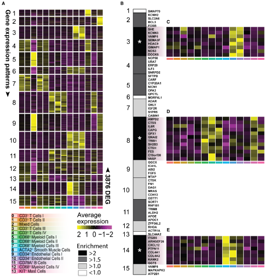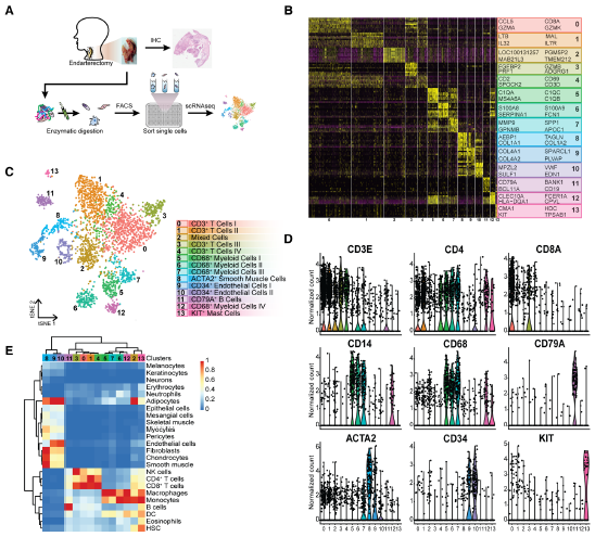 我們觀察到3個(gè)非免疫細(xì)胞簇(簇8,9和10;表達(dá)CD34和ACTA2[肌動(dòng)蛋白α2,平滑肌])和11個(gè)白細(xì)胞簇(圖1B和1D)。后者包括5個(gè)淋巴細(xì)胞簇(第0、1、3、4、11簇;表達(dá)CD3E、CD4、CD8、CD79A),5個(gè)髓系簇(第5、6、7、12和13簇;表達(dá)CD14、CD68、KIT),和1個(gè)沒有明確的細(xì)胞類型表達(dá)譜的混合細(xì)胞的簇(第2簇),但與其他簇有相似的基因表達(dá),似乎主要含有凋亡的髓系細(xì)胞和T細(xì)胞(圖1B和1D)。T細(xì)胞是我們數(shù)據(jù)集中豐富的群體,占所有分析細(xì)胞的52.4%,而髓系群體占所有細(xì)胞的18.5%。