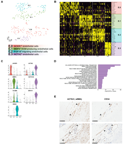 EC簇之間的聚集以及SMC相關(guān)通路的富集(圖2D),表明這個(gè)亞群可能正在經(jīng)歷內(nèi)皮細(xì)胞向間充質(zhì)細(xì)胞的轉(zhuǎn)變,或者反之亦然。為了驗(yàn)證這些發(fā)現(xiàn),我們觀察了ACTA2和CD34在連續(xù)的組織學(xué)切片上的表達(dá)(圖2E)。