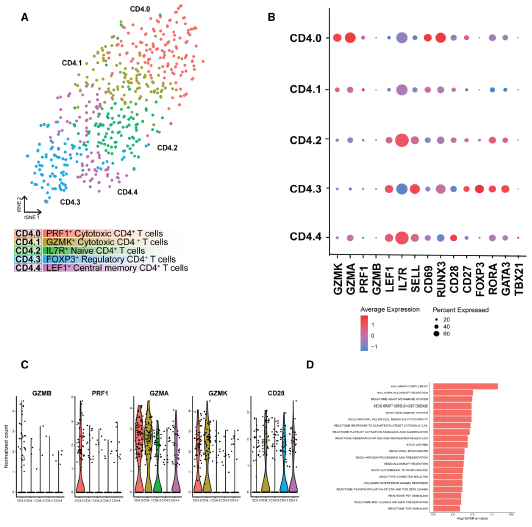 為了更詳細(xì)地定義T細(xì)胞,我們分離和重新聚類CD4+T細(xì)胞,發(fā)現(xiàn)了5個(gè)亞類(CD4.0-CD4.4,圖3A),其中主要的區(qū)別是它們的激活狀態(tài),而不是通常用于定義CD4+T輔助亞群的轉(zhuǎn)錄因子和細(xì)胞因子(圖3B和3C)。CD4.0和CD4.1具有細(xì)胞毒基因表達(dá)譜,此外,這一簇中的基因表達(dá)證實(shí)了與適應(yīng)性免疫反應(yīng)相關(guān)的促炎通路的富集(圖3D)。