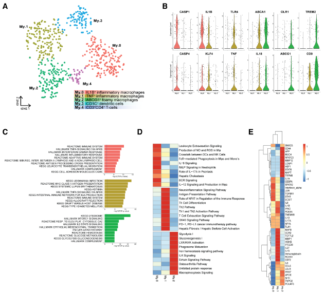 我們分離和重新聚類動(dòng)脈粥樣硬化性髓系細(xì)胞,揭示了5種不同的表型(My.0-My.4,圖4A)。My.0、My.1和My.2很可能代表不同激活狀態(tài)的巨噬細(xì)胞。促炎標(biāo)志物基因(圖4B)以及免疫和炎癥通路的富集結(jié)果(圖4C)表明,My.0和My.1亞類由促炎巨噬細(xì)胞組成。My.0顯示了最近招募的巨噬細(xì)胞的特征(圖4C,D),表明共表達(dá)的炎癥體被激活(圖4B)。與My.0和My.1相比,My.2缺乏明顯的促炎標(biāo)志物,并顯示巨噬細(xì)胞和泡沫細(xì)胞的跡象。