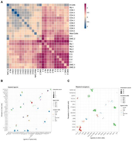 接下來,我們基于CellPhone?DB v2.0檢查了不同細(xì)胞類型之間潛在的配體-受體相互作用,以預(yù)測(cè)病變內(nèi)的細(xì)胞間通訊。淋巴細(xì)胞和肥大細(xì)胞的潛在相互作用的絕對(duì)數(shù)低,而髓系細(xì)胞、內(nèi)皮細(xì)胞和平滑肌細(xì)胞的相互作用的絕對(duì)數(shù)高(圖5A)。