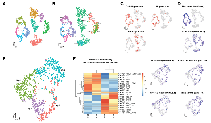 利用scATAC-seq,我們檢測(cè)了人類斑塊中髓系和T細(xì)胞的開放染色質(zhì)啟動(dòng)子和增強(qiáng)子圖譜。我們用scATACseq鑒定了4個(gè)髓系細(xì)胞簇和5個(gè)T細(xì)胞簇 (圖6A和6B)。巨噬細(xì)胞(CSF1R,IL1B)和T細(xì)胞特異性基因(NKG7)的開放染色質(zhì),以及巨噬細(xì)胞和T細(xì)胞(SPI155和ETS156)的細(xì)胞型TFs的motif的富集,明確了細(xì)胞類型之間的劃分界限(圖6C和6D)。轉(zhuǎn)移的髓系群體被重新聚類,類似于scRNA-seq簇(圖6E)。