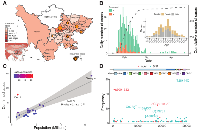 (A)中國四川省COVID-19確診和測序病例的地理分布。已確認的病例編號是彩色的,圓圈的大小與排序病例的數量成比例。(B)四川省COVID-19 pcr確診病例的時間序列。本研究根據病例是否測序進行分類。虛線表示累計病例數。(C)四川省21個城市確診病例數與人口規(guī)模的關系。(D)四川人群SARS-CoV-2基因組中SNP(藍色)和indel(紅色)的頻率。y軸表示SARS-CoV-2基因組中的位置。