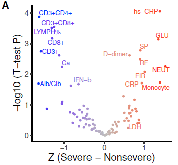 ?圖3A 與COVID-19嚴重程度相關的顯著特征的火山圖